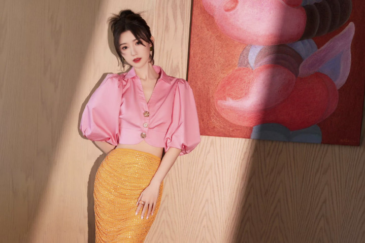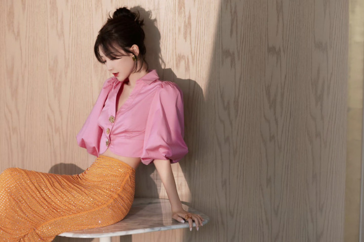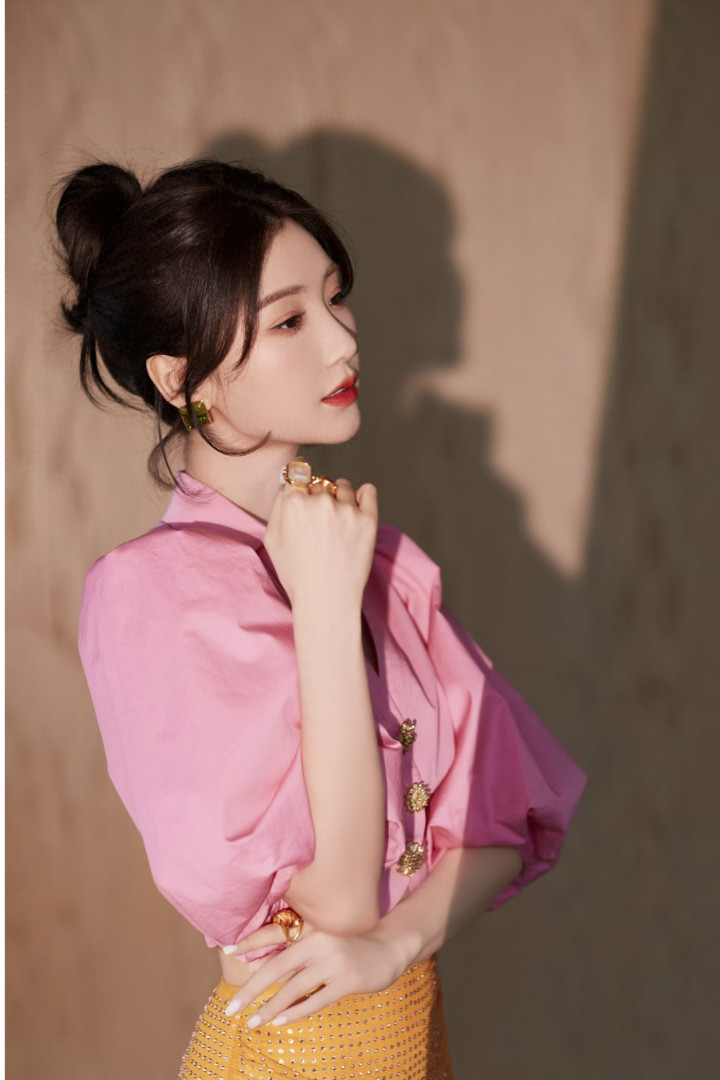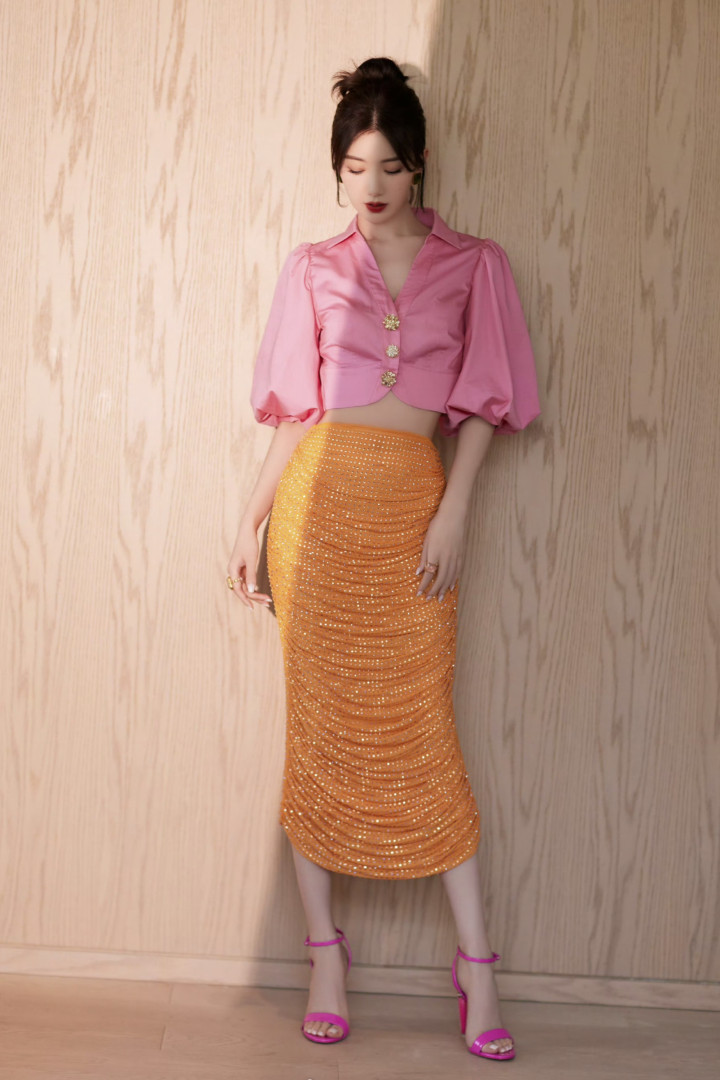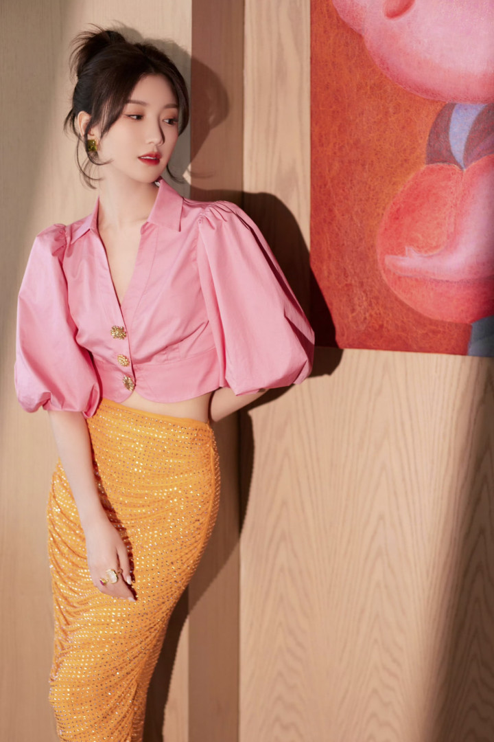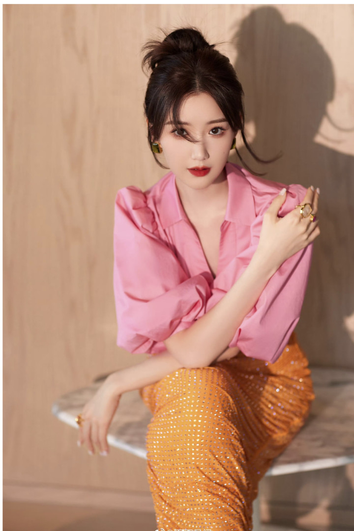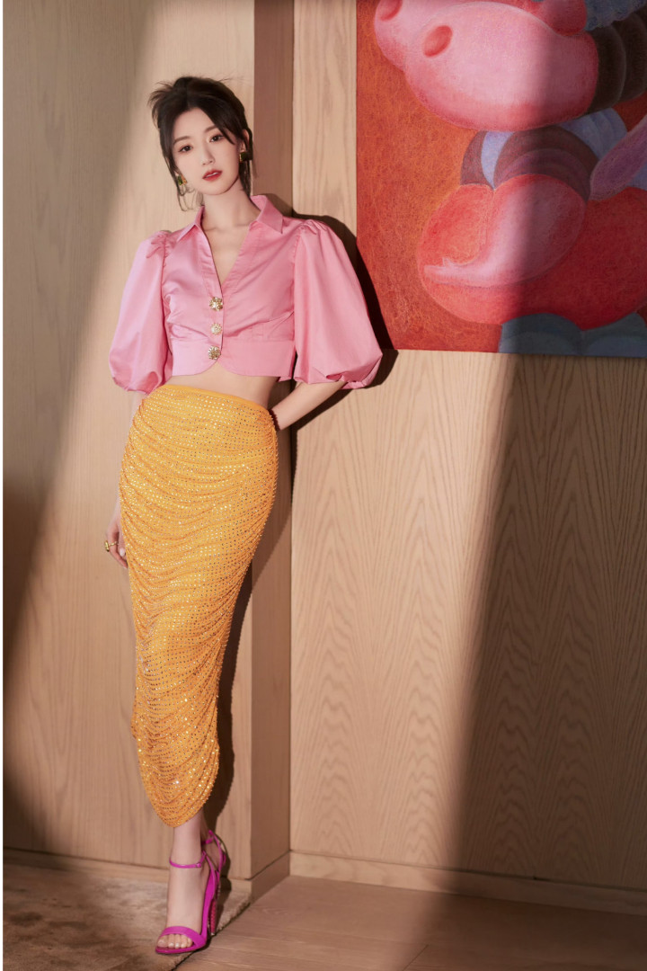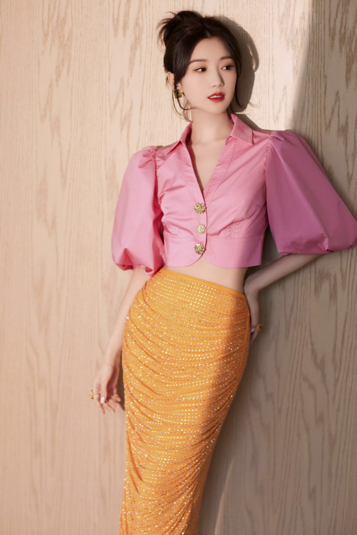 而这组粉橙撞色的写真,又掀开了毛晓彤美的另一重维度。玫粉色短款衬衫带着复古的泡泡袖设计,利落的剪裁露出纤细的腰肢,少女的娇俏与轻熟的妩媚在此间平衡;亮橙色的鱼尾裙缀满细碎钻饰,褶皱的肌理让裙摆如流动的霞光,行走间摇曳出灵动的韵律。粉与橙的高饱和度碰撞,本是极具挑战性的搭配,却被毛晓彤驾驭得恰到好处——明艳的色彩没有掩盖她的温柔,反而衬得她肌肤胜雪,红唇微扬时,眉眼间的风情像被点亮的霓虹,鲜活又热烈。