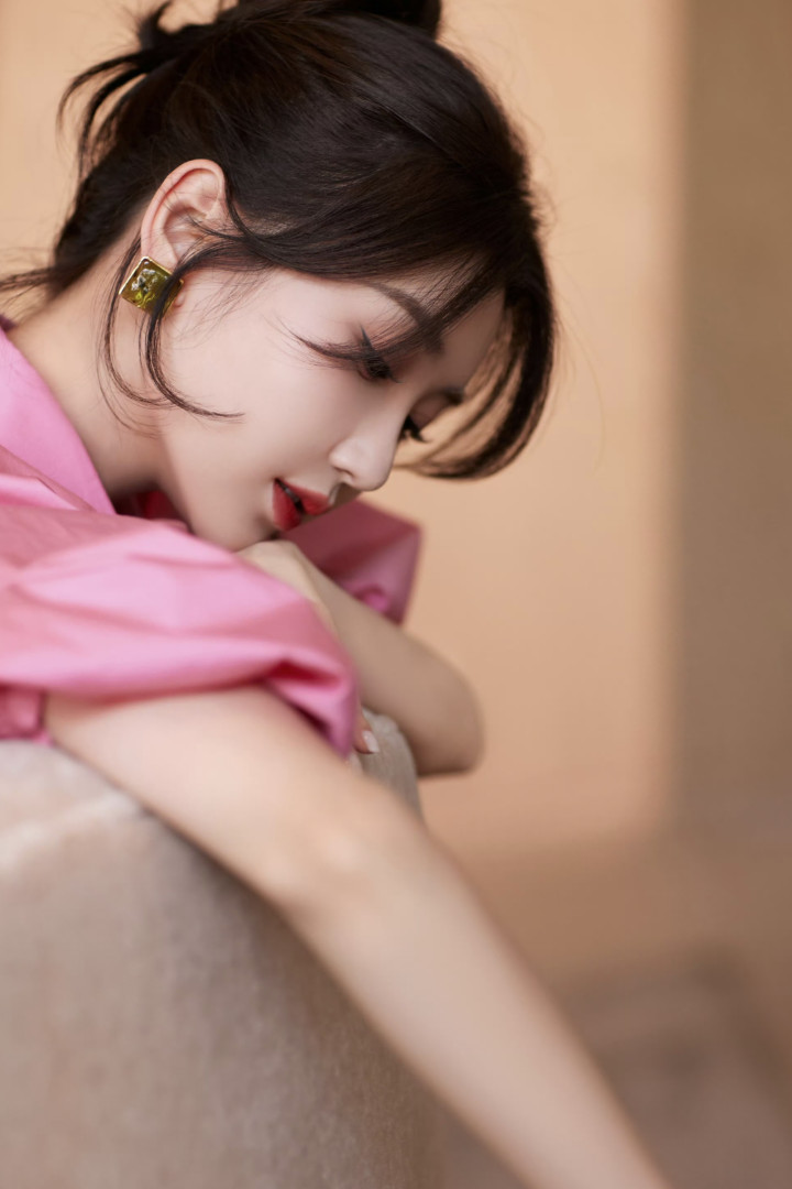 镜头前的她,或倚着木质背景回眸,光影在她轮廓上勾勒出柔和的线条,撞色穿搭的张扬与光影的温柔交织;或蜷身轻靠,眉眼低垂时,又露出几分娇憨的少女感;或踩着玫红高跟鞋站立,身姿挺拔,将都市女性的自信与优雅展现得淋漓尽致。她用不同的姿态,诠释着这套造型的多面性:可以是明艳张扬的时尚女郎,也可以是温柔缱绻的邻家女孩,色彩的碰撞在她身上,化作了风格的百变。