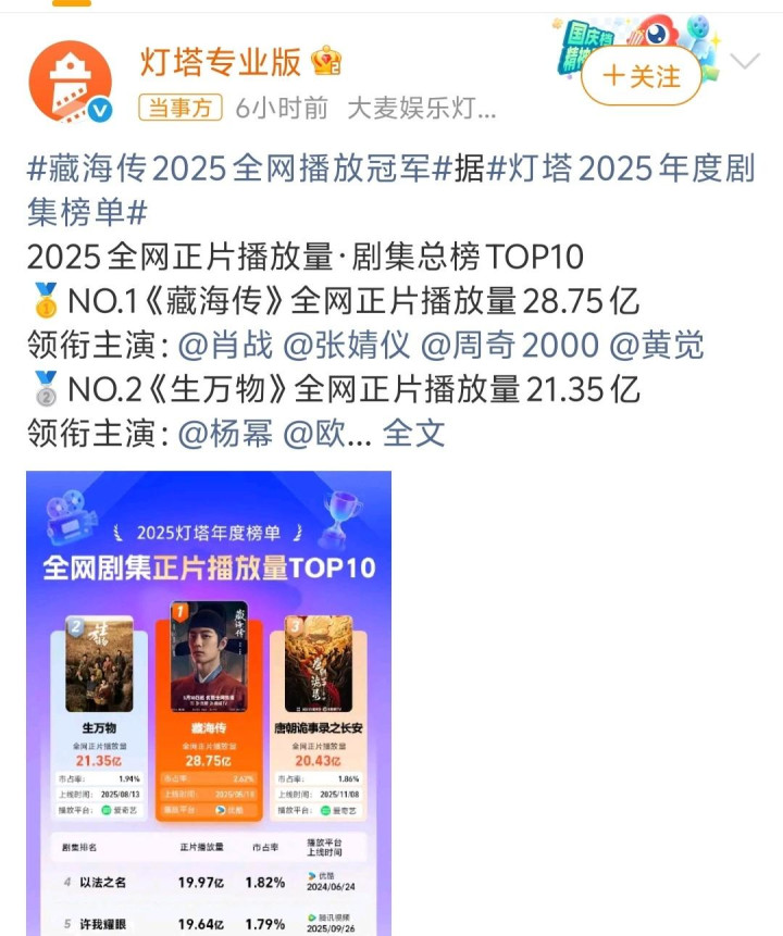 猫眼剧集热度周冠3次,猫眼电视剧热度日冠32次,全网收视日冠13次!灯塔2025年度剧集榜单,《藏海传》以全网正片播放量28.75亿的断层优势登顶2025年剧集总榜冠军。《藏海传》单日最高播放量达1.18亿,全年24次斩获单日冠军,长尾效应显著,收官170天仍居平台飙升榜首位。包揽2025年全网剧集类目全部冠军。《藏海传》开播29小时冲入年榜前20,22天登顶年榜首位,刷新平台最快登顶纪录。