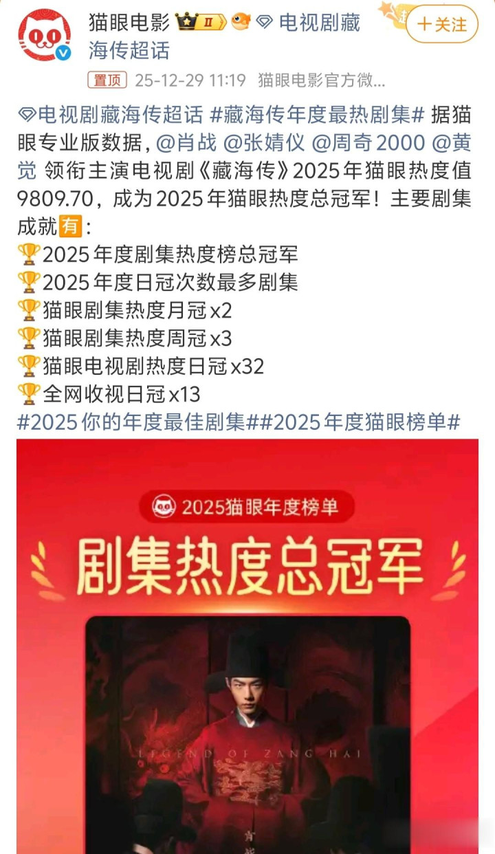 《藏海传》横扫权威平台七大细分榜单,现象级剧王地位无可争议!年末大总结来了。各平台官方战报也是纷纷新鲜出炉。注意,这是官方的总结认证,货真价实。据猫眼专业版数据显示,肖战领衔主演电视剧《藏海传》2025年猫眼热度值9809.70,成为2025年猫眼热度总冠军!主要剧集成就有:2025年度剧集热度榜总冠军,2025年度日冠次数最多剧集,猫眼剧集热度月冠2次,