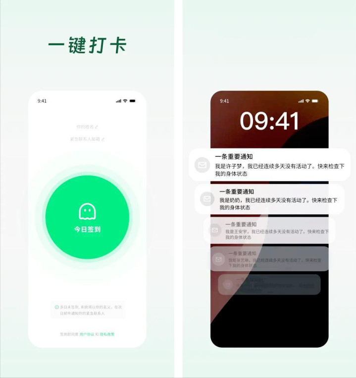 它的功能逻辑简单到令人发指:你给这软件绑定一个联系人,然后你每天的任务就是点击一下屏幕上的“今日签到”按钮。