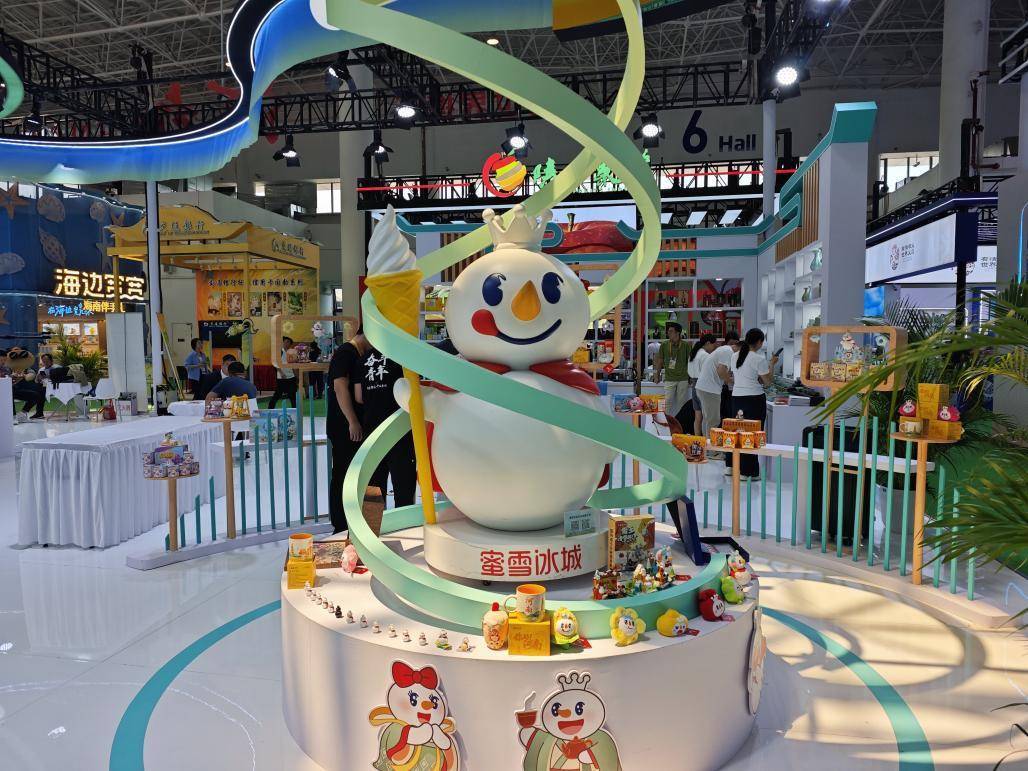 超大型雪王IP雕塑,是展馆内的“打卡热点”,吸引了大批观众驻足围观、拍照留念。记者看到,雪王头戴标志性皇冠,系着红围巾,手持巨型甜筒,身体被螺旋状的飘带环绕,从底座向上盘旋,仿佛从甜筒世界“跃出”。周围还摆满了雪王主题盲盒、手办、周边文创。